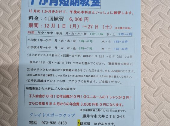 冬休み短期教室を開催します! 今回は3日間で4000円です。しっかりと身体を動か